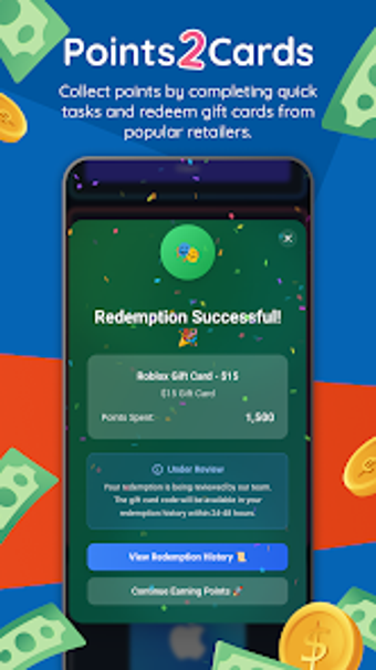 ด้วยอินเทอร์เฟซที่ใช้งานง่าย Points2Cards มีฟีดงานที่ปรับแต่งได้ซึ่งแนะนำกิจกรรมที่มีมูลค่าสูงตามความสนใจของผู้ใช้ งานต่างๆ ใช้เวลาเพียงไม่กี่นาทีในการทำให้เสร็จ และมีให้บริการทั่วโลกพร้อมการสนับสนุนหลายภาษา ผู้ใช้สามารถติดตามความก้าวหน้า เฉลิมฉลองความสำเร็จ และจัดการรหัสบัตรของขวัญของตนได้อย่างราบรื่นภายในแอป ทำให้มั่นใจได้ว่าประสบการณ์ที่คุ้มค่าที่ปรับให้เข้ากับตารางเวลาของพวกเขา